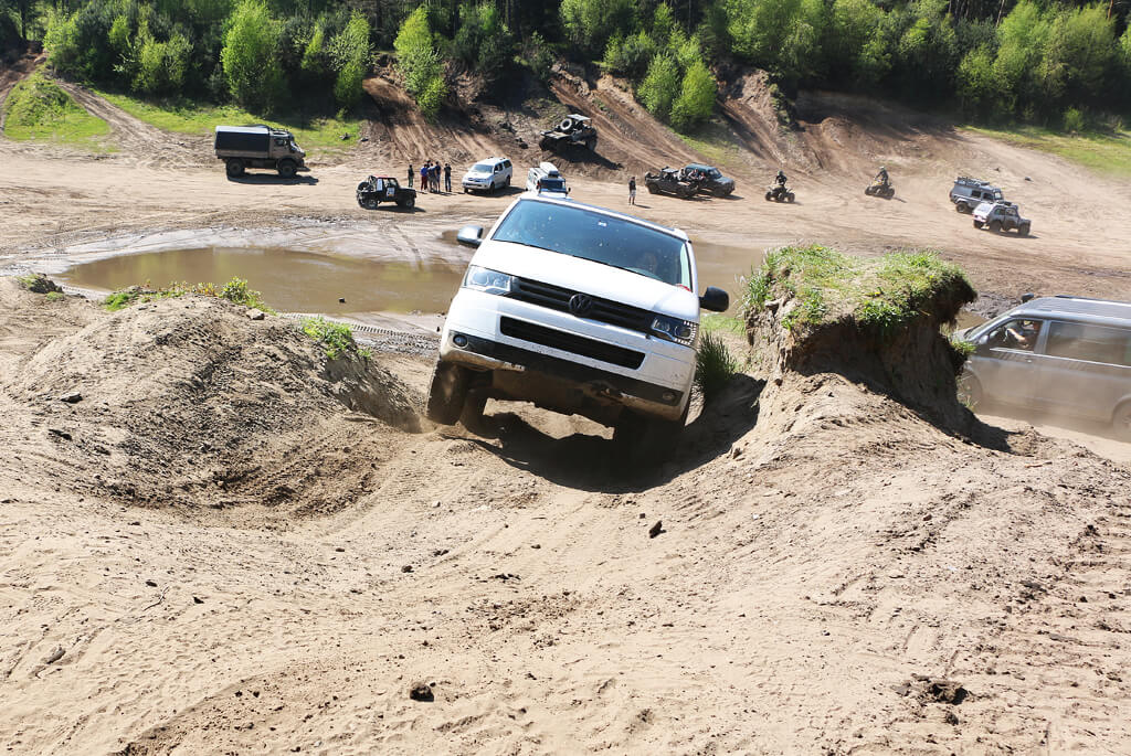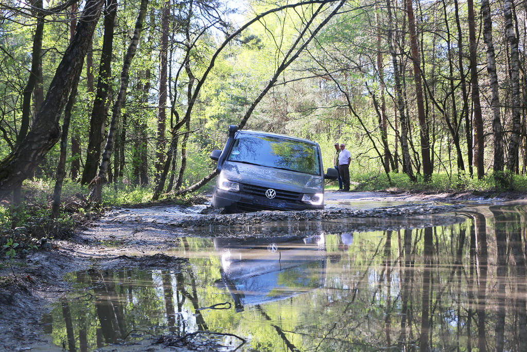 Das Trainingsprogramm startete morgens mit einer detaillierten Einweisung zur technischen Ausstattung von Volkswagen T5/T6 4MOTION-Modellen, sowie theoretischen Anleitungen zum anschließenden Fahren im Gelände. Dabei waren das bewusste Ausschalten von ESP, der Einsatz der Differentialsperre und der geländeangepasste Reifenfülldruck wichtige Themen. Anschließend ging es zu den einzelnen Sektionen, die unter Leitung der Instruktoren zunächst abgelaufen und dabei erläutert wurden.