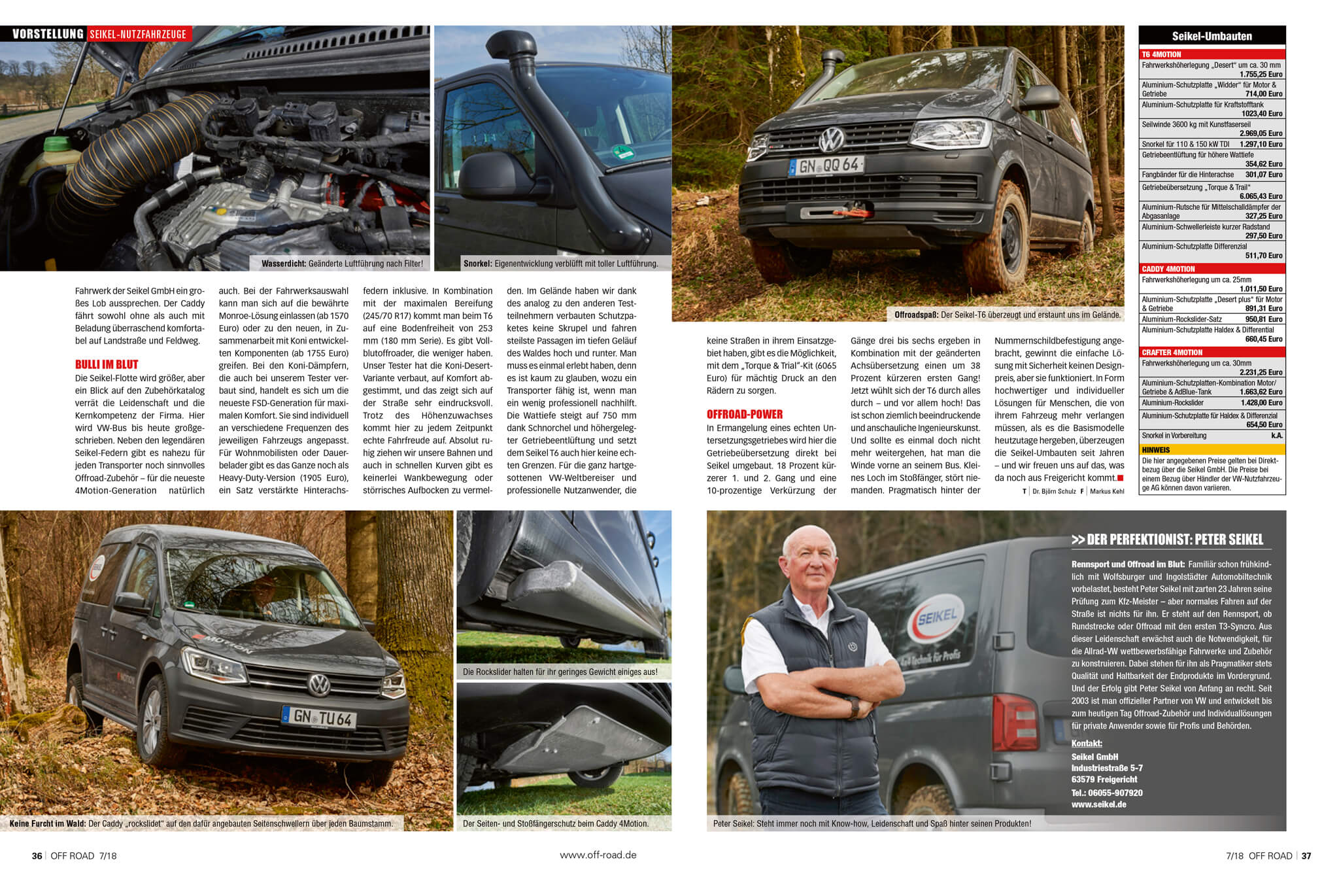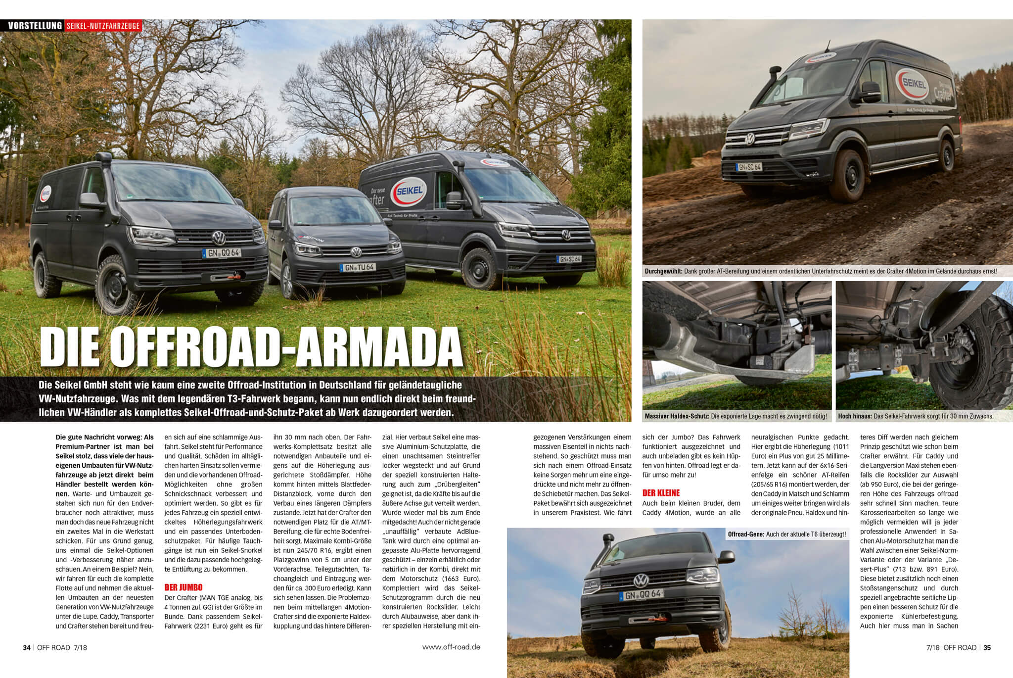SEIKEL-Komponenten sind jetzt beim Volkswagen Nutzfahrzeuge Partner mit dem neuen Fahrzeug auch ab Werk mitbestellbar. In einem umfassenden Artikel der neuen Ausgabe der Zeitschrift OFF Road 07/2018 wird die „Offrroad-Armada“ mit unseren Fahrwerkshöherlegungen, Schutzplatten und mehr beschrieben. In detaillierte Beschreibungen und Bildern wird näher auf den Volkswagen T6, Crafter und Caddy eingegangen. Aber, lesen Sie selbst …