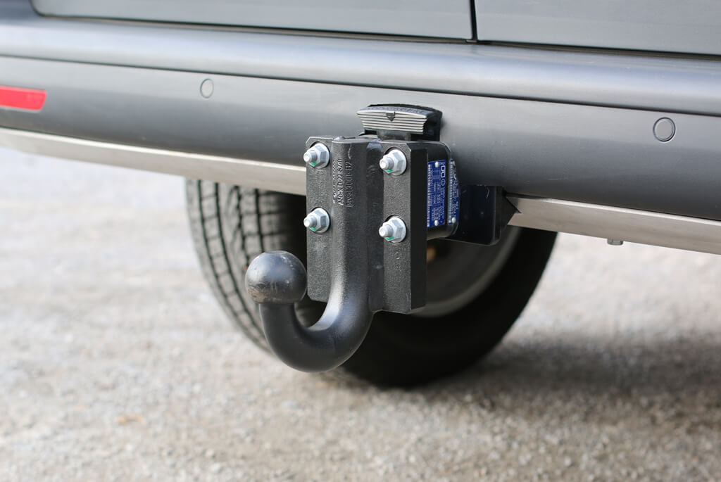 TESCHAU-Anhängevorrichtung mit 60 mm tiefergelegtem Kugelkopf und ROCKINGER-Wechselkupplung. Die Steckdose für den Anhängerbetrieb ist geschützt verbaut.